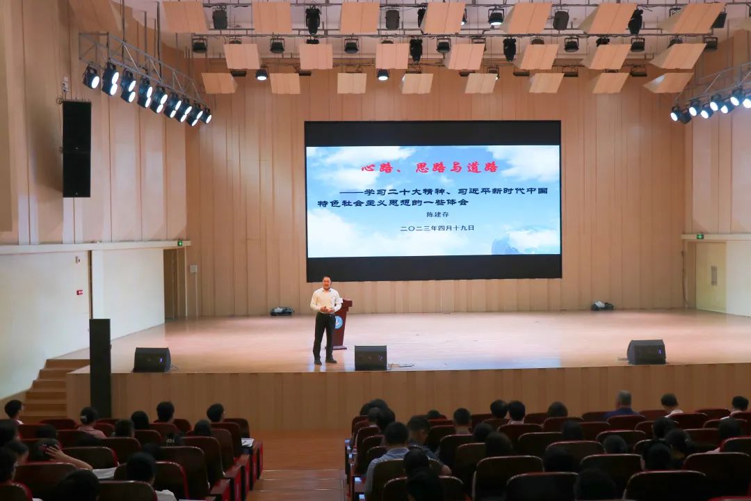 为开展好学习贯彻习近平新时代中国特色社会主义思想主题教育,4月19日,学校副校长陈建存在音乐厅以《心路、思路与道路——学习二十大精神、习近平新时代中国特色社会主义思想的一些体会》为题,开展专题辅导报告。发展规划处、法制办公室、人力资源处、离退休人员工作办公室、团委、档案馆、音乐与舞蹈学院、化学与环境学院等单位共300多名党员师生参加了本次主题教育辅导报告会。