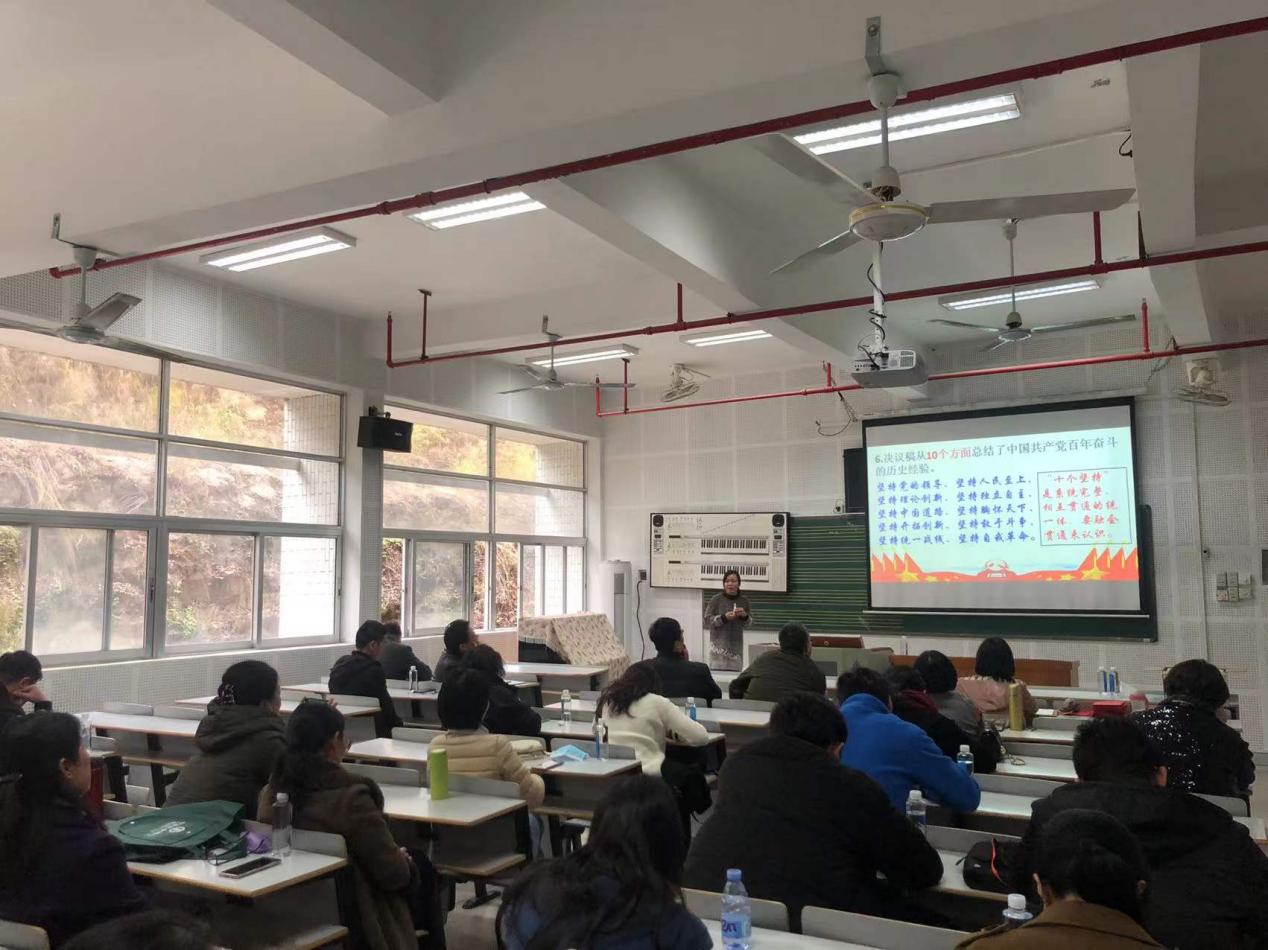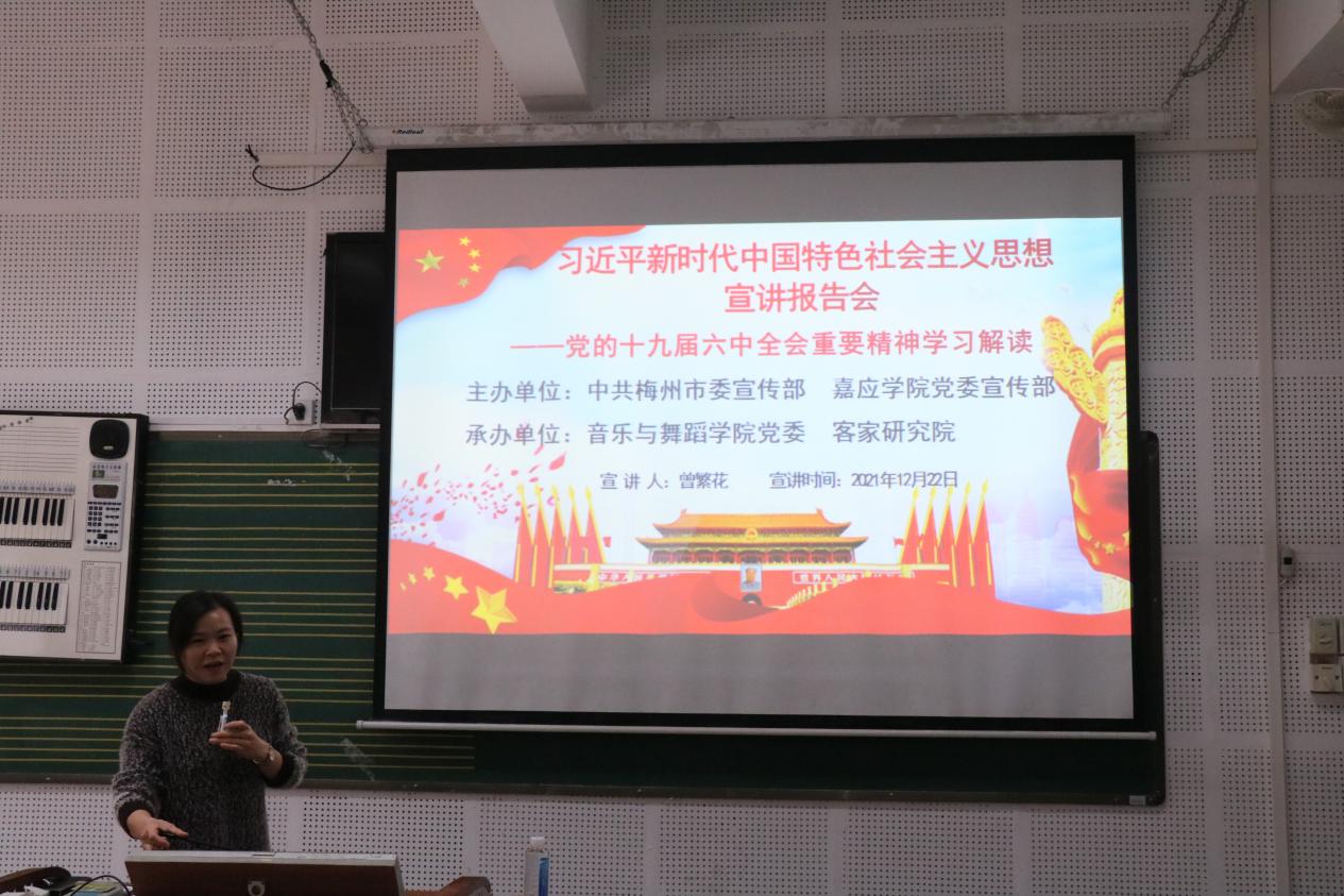 为深入学习贯彻党的十九届六中全会精神,引导全体教师党员自觉用十九届六中全会精神武装思想、指导实践、推动工作。我院联合客家研究院于12月22日在活活艺术教育中心A305教室举行学习贯彻党的十九届六中全会精神宣讲会。学校宣讲团成员马克思主义学院副院长曾繁花博士为教师党员作题为《党的十九届六中全会精神学习:继往不平凡,奋进新征程》的专场学习宣讲,会议由我院党委书记高华珊主持,教工党员45人参加了此次学习。