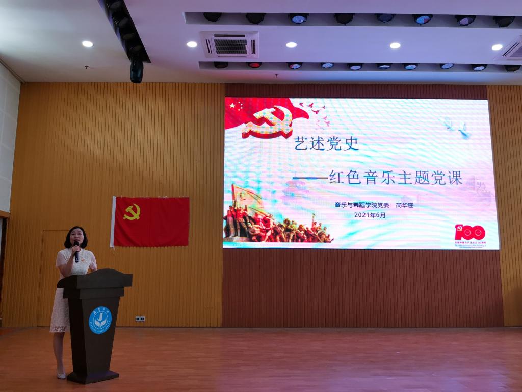 为庆祝中国共产党成立100周年,在学习党史中践行党的初心使命,不断强化党史学习教育的成果,6月26日上午,音乐与舞蹈学院在活活A201教室开展以“艺述党史——用‘音舞之美’传承‘党史之光’”为题的专题党课,将专业和党史学习教育创新融合,运用艺术的力量、影像的感染力以及现场演绎的生动形式,探索更有深度、更有温度、更有色彩的党史学习教育新模式。本次党课由学院党委书记高华珊主讲,全体辅导员及学生党员、积极分子共计110余人参加了学习。