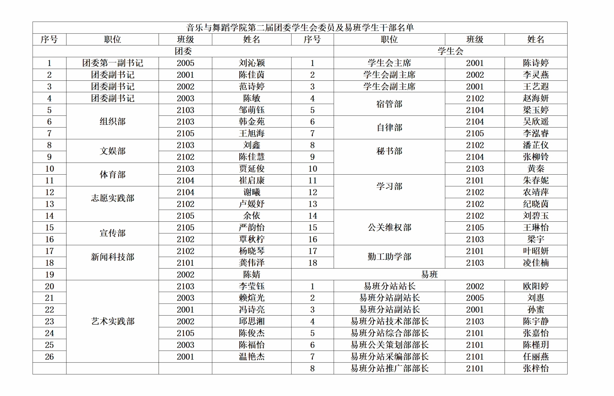 音乐与舞蹈学院第二届团委学生会委员及易班学生干部名单