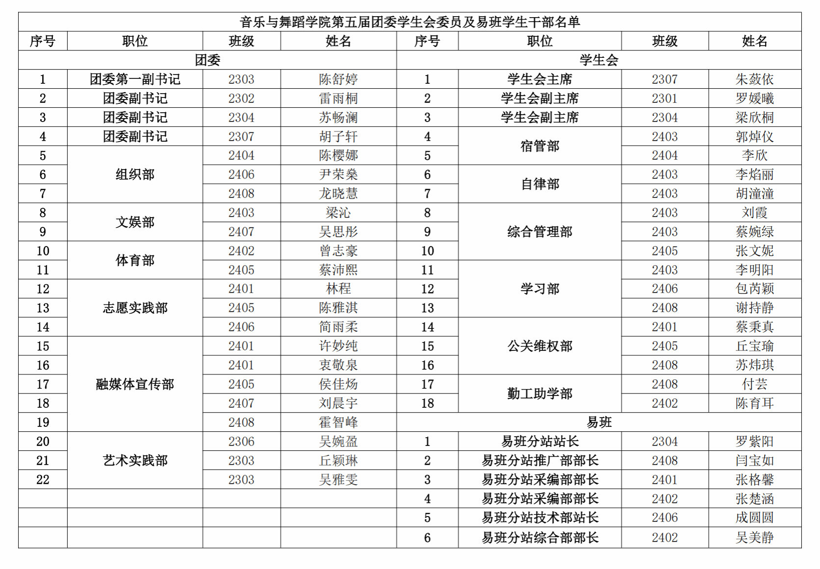 音乐与舞蹈学院第五届团委学生会委员及易班学生干部名单