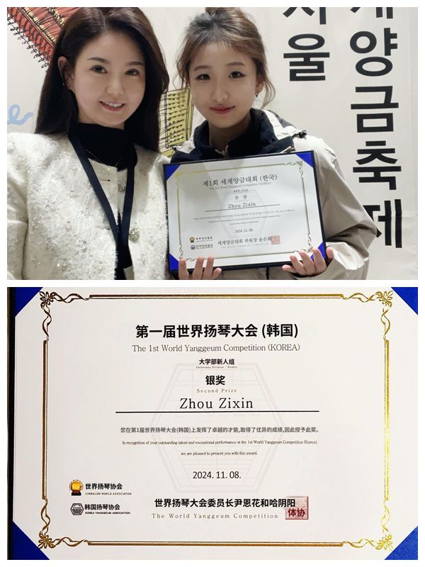 11月3至8日,第十七届世界扬琴大会暨首届世界扬琴大赛在韩国首尔举行,我院22级音乐学专业学生周子欣(指导老师姚雪博士)获得“大学部新人组银奖”。