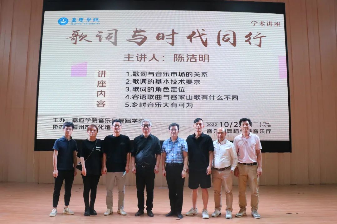 为加强我院学科建设,10月25日下午,我院在活活艺术教育中心音乐厅举办了“歌词与时代同行”专题讲座。本次讲座邀请到了我国著名的词作家、中国音乐文学学会原副主席、中国音乐家协会流行音乐学会副主席陈洁明老师为师生授课,讲座由李君院长主持,我院师生150余人和梅州市部分群文工作者参加了本次学习。
