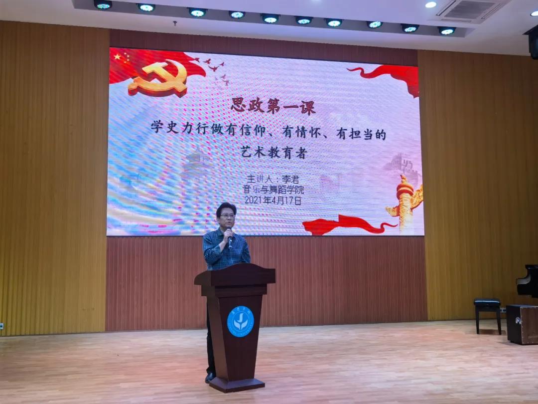 为了贯彻习近平总书记关于“思想政治理论课是落实立德树人根本任务的关键课程精神”。按照学校党委的要求,我院院长李君老师于2021年4月17日下午在活活艺术教育中心B201教室给学院学生讲授本学期思政第一课。李院长以《学史力行做有信仰、有情怀、有担当的艺术教育者》为主题,结合专业实际,给同学们讲授了一次生动且深刻的思政课。