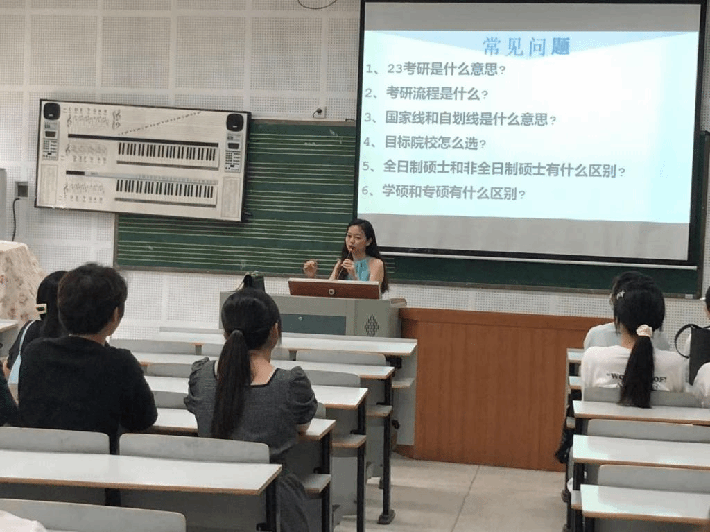 讲座初始,杨靖老师从为什么考研、考研的意义展开,为同学们分析了考研的形势与动态,鼓励同学们积极报考硕士研究生,成就自己的求学深造的梦想。随后2022届毕业准研究生李佳怡、陈静雯结合专业特点分别为音乐学、舞蹈学专业的同学详细讲述了现阶段的考研情况、考研方向、考研准备,同时为大家提出一些关于学习上的建议。