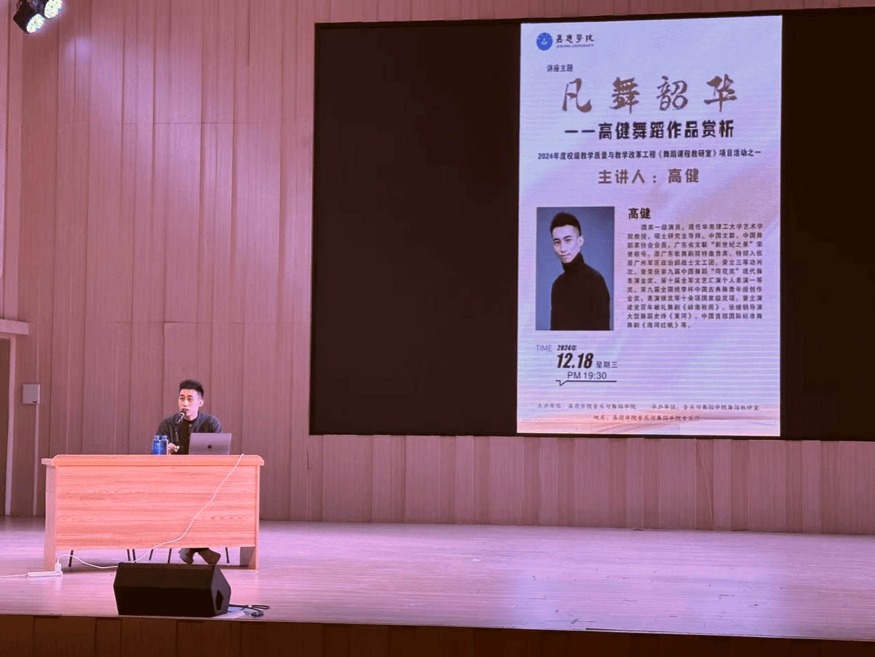 2024年12月18日,由嘉应学院音乐与舞蹈学院主办的“凡舞韶华一一高健舞蹈作品赏析”讲座如期举行,本次讲座由国家一级演员、华南理工大学艺术学院第一党支部书记高健教授主讲。