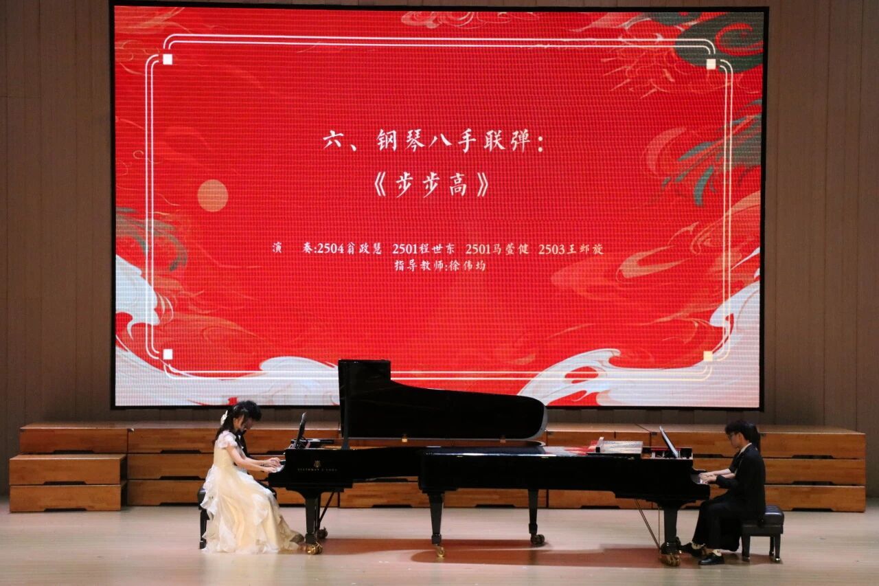 钢琴八手联弹《步步高》节奏明快活泼,四位演奏者默契配合,让旋律层层递进,满是向上的活力。