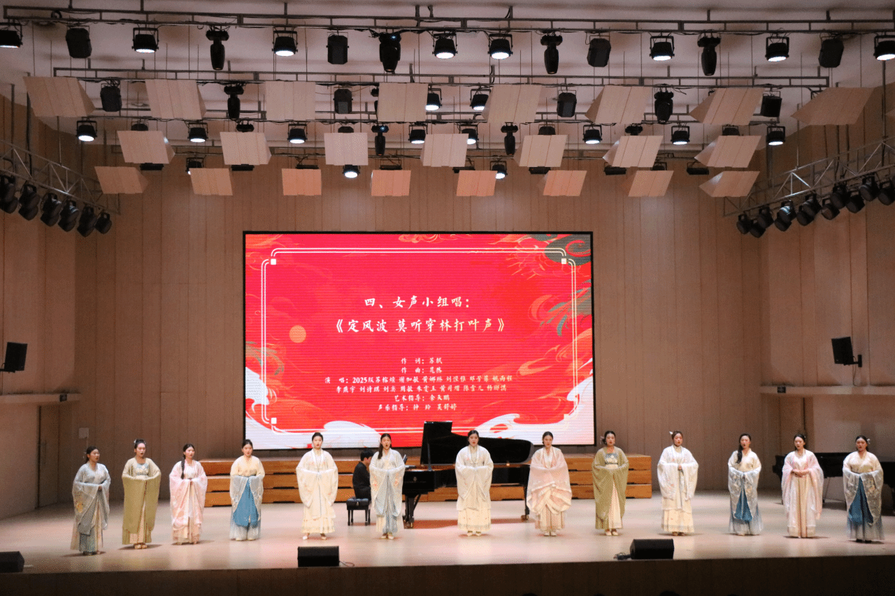女生小组唱《定风波·莫听穿林打叶声》将古典诗词与悠扬旋律相融,唱出苏轼的豁达心境,和声和谐动人。