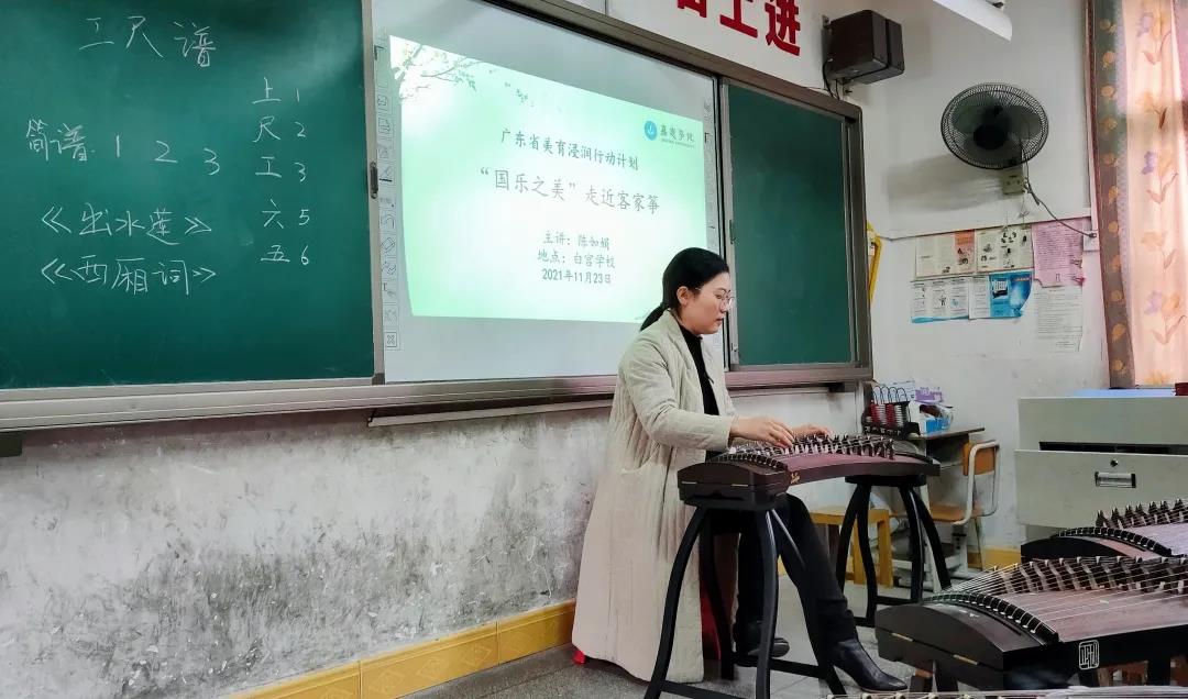 作为2021嘉应学院美育浸润行动计划活动之一,11月23日上午我院器乐教研室陈如娟老师和她的团队为梅江区白宫学校分校区带来了一场以“国乐之美”走进客家筝为主题的音乐课堂。
