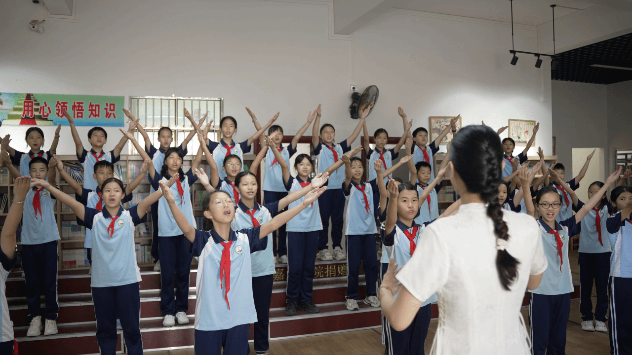 爱国主义主题合唱活动以班级为单位热烈开展,激昂的旋律回荡在校园的每一个角落。活动要求各班集体排练并演唱《爱国歌》《和你一起》两首歌,传递对祖国的热爱。嘉应学院声乐教师分组进驻各班指导。教师从科学发声教起,指导孩子调整气息、把控音准,纠正跑调、扯嗓问题;针对和声配合,通过分声部练习等方式打造和谐合唱效果;在情感表达上,结合歌曲主题讲述祖国发展与美好生活,引导孩子融入爱国之情。课堂上,孩子们精神饱满、声音洪亮,演唱饱含深情。各班课余刻苦排练,校园里满是孩子们认真练习的身影,嘹亮歌声回荡,汇成动人的爱国赞歌。