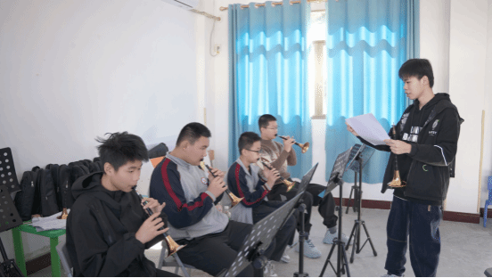 排练课堂上,学生们精神饱满、神情专注:唢呐的高亢旋律与童真意境交织,时而如“书包轻晃”的轻快跳跃,时而如“学堂晨读”的悠扬舒展。大家反复打磨节奏(如切分音、附点音符的处理)、呼应声部(避免“抢拍”或“滞后”),力求还原童谣的活泼质感。排练室里,清脆的唢呐声此起彼伏,汇成一首动人的“童趣民乐赞歌”。